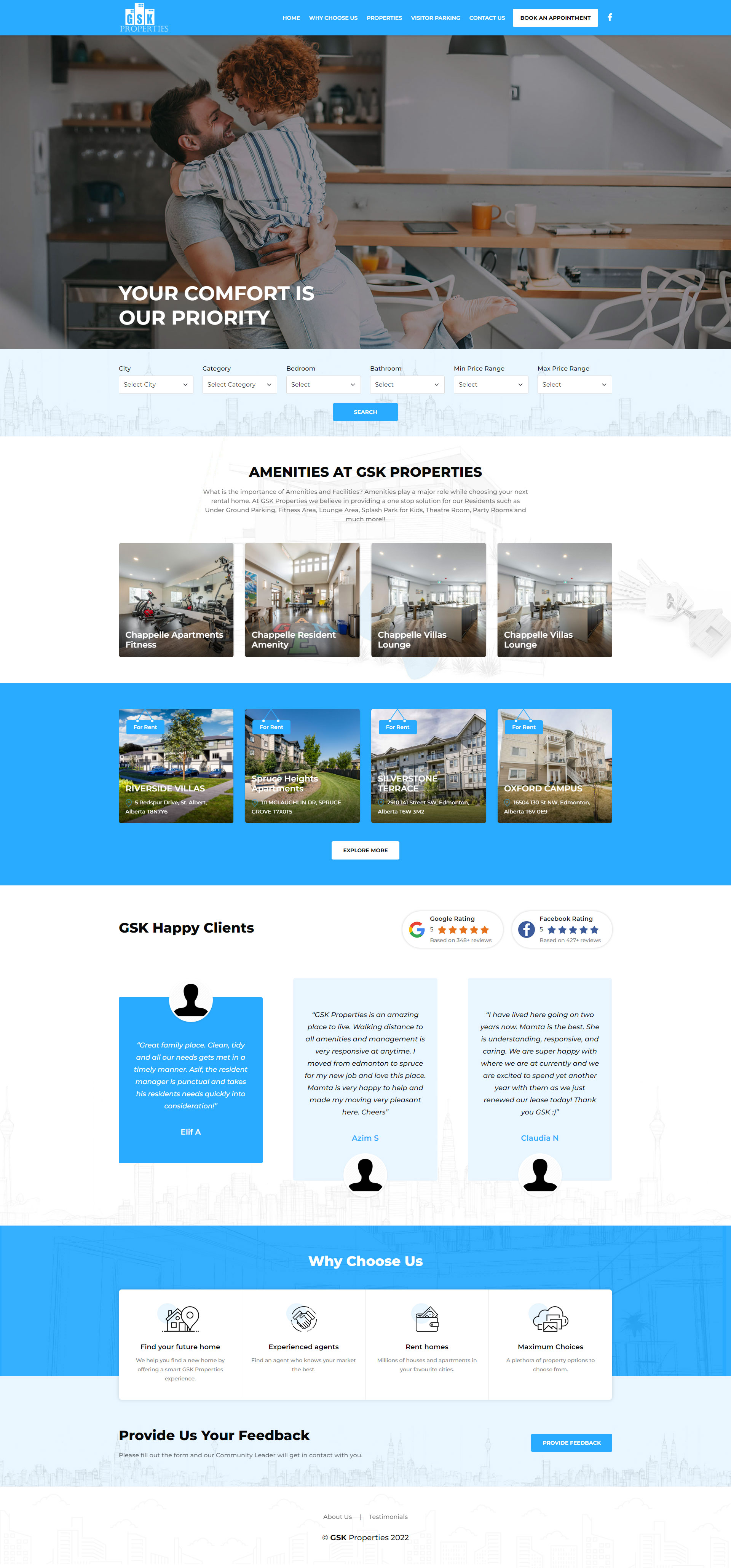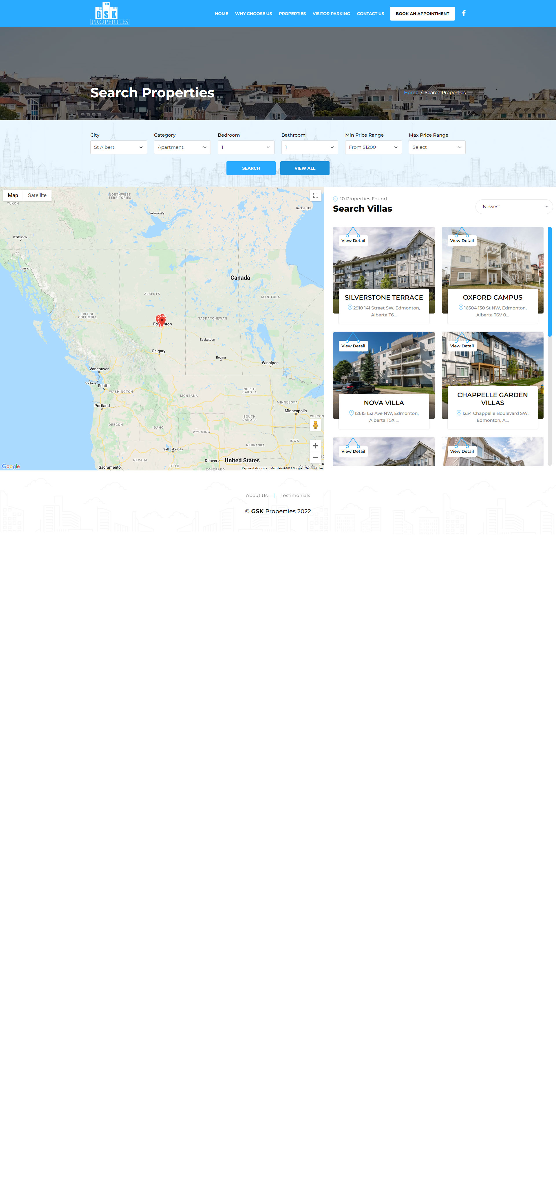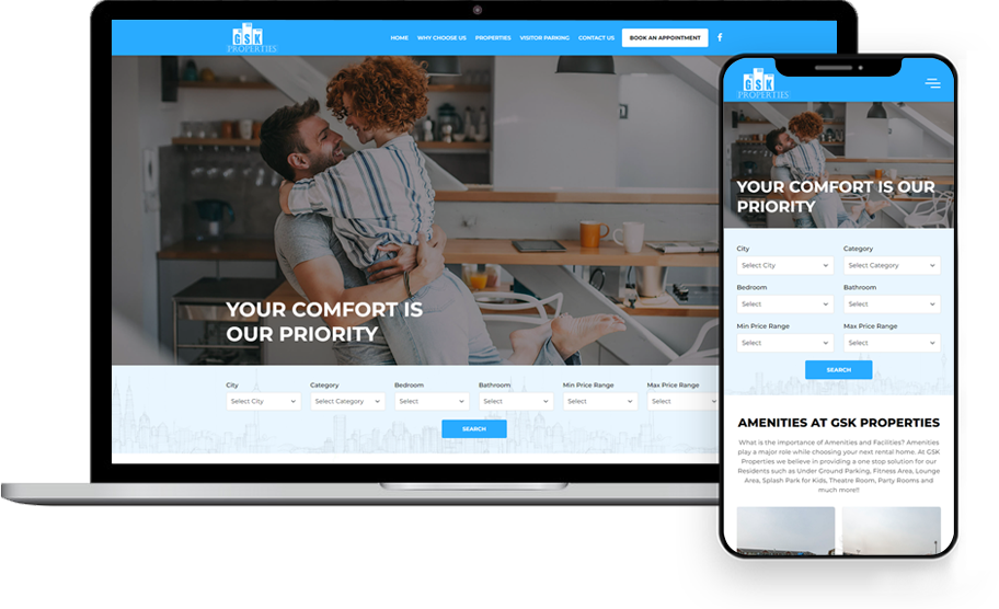 GSK- a property listing website service ensuring effective property management. The website has a very simple business model. It aims at attracting customers to their site and exploring the posted properties by the admin. Multiple searches with a live map make the search for property quite easy for the users. Each property has its dedicated detail page with an option to book appointments for each posted property. Indeed, GSK is a user-friendly website.